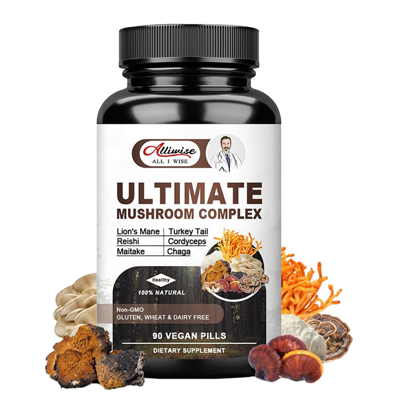El Ultimate Mushroom Complex de Alliwise es una potente mezcla de seis hongos medicinales, que incluye Lion’s Mane, Reishi, Maitake, Turkey Tail, Cordyceps y Chaga. Esta fórmula 100% natural está diseñada para apoyar el bienestar general, la función cognitiva y el sistema inmunológico, aprovechando los beneficios de los súperalimentos funcionales.